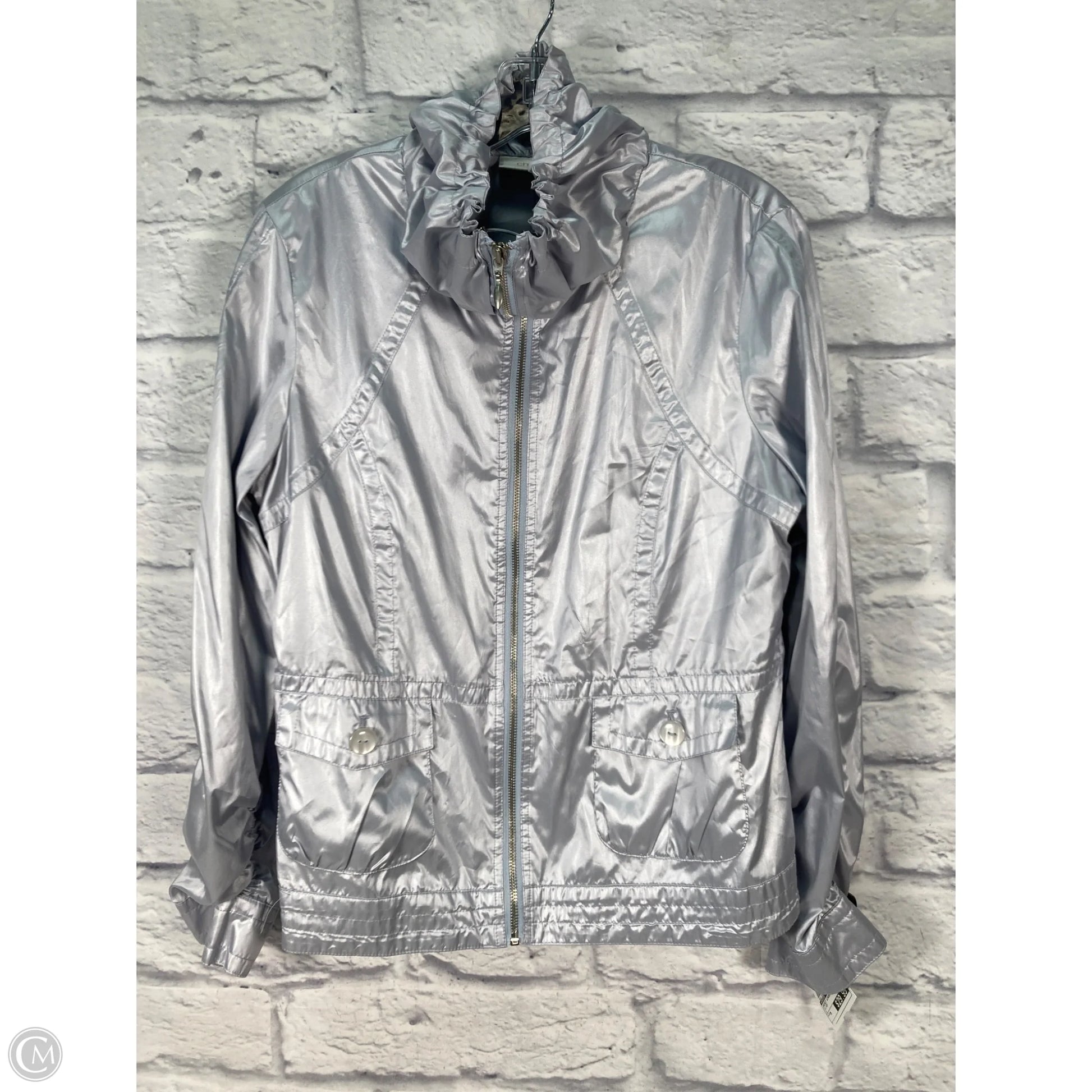 Jacket Windbreaker By Chicos In Silver, Size: M